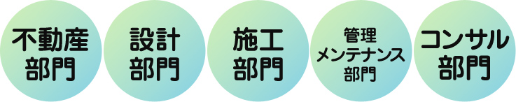 弊社は5つの部門に分かれ、お客様の土地・建物の設計施工・運用・メンテナンスまで、トータルに対応しています。物件のご相談はもちろん新築・リフォーム・建物の維持管理まで、不動産に関わるご相談に柔軟にお応えいたしますので、お気軽にお問い合わせください。