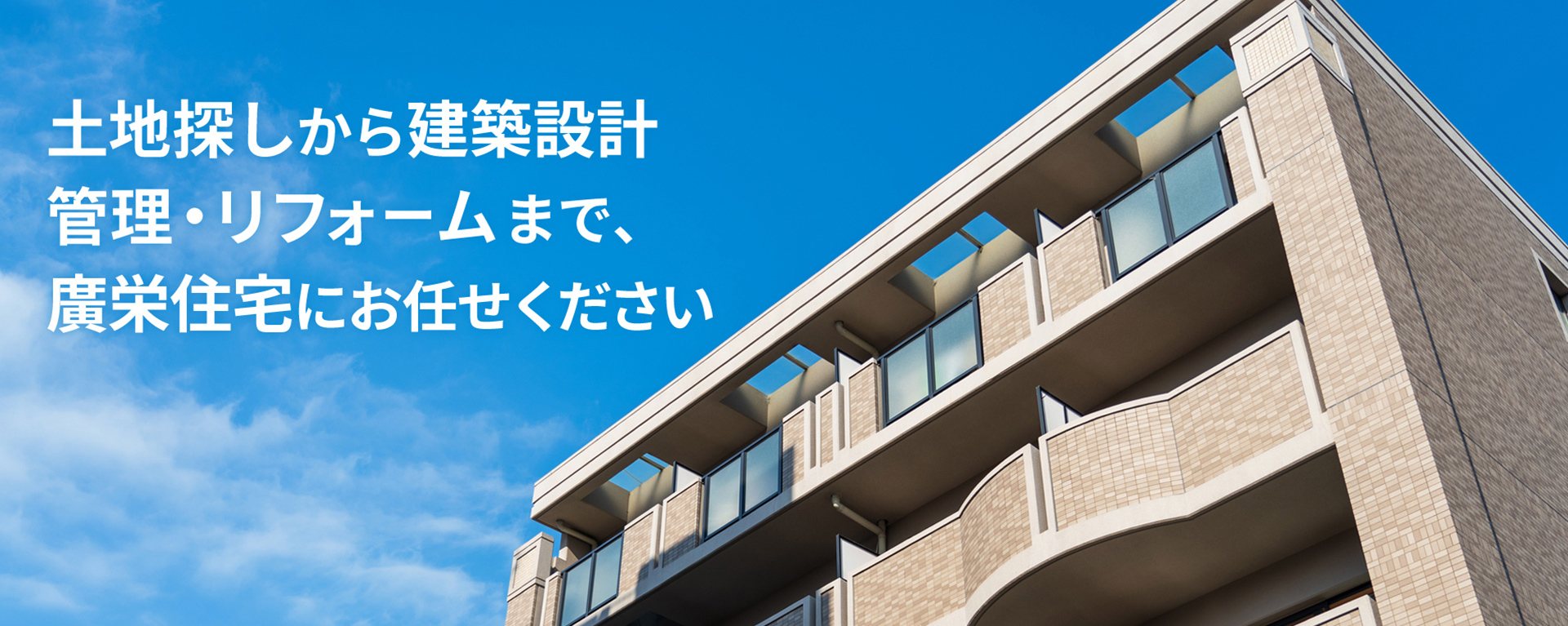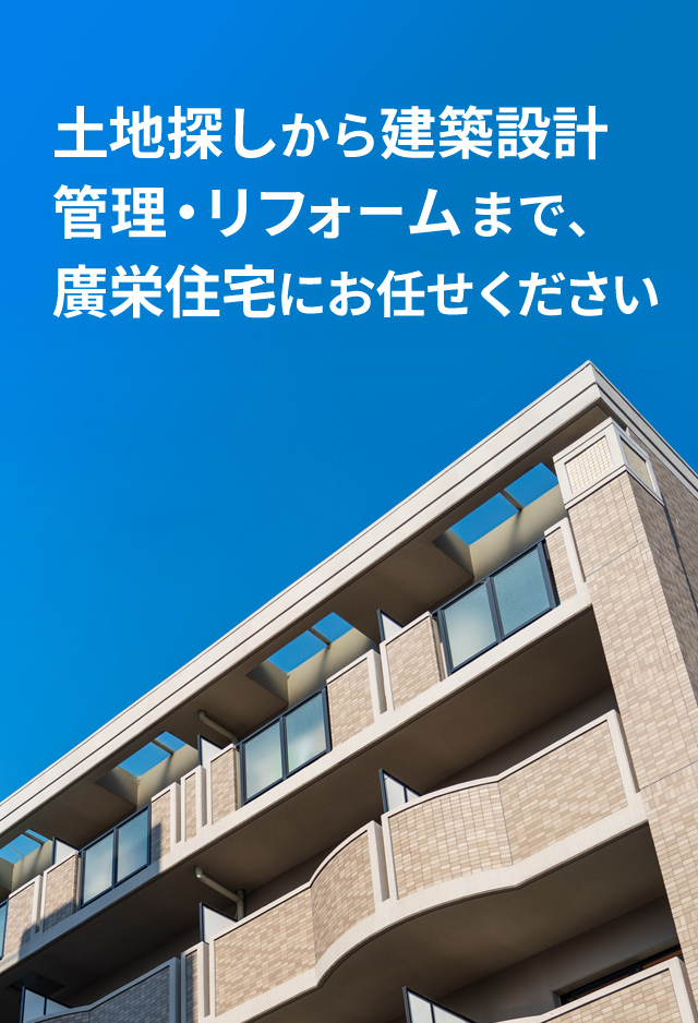 - 廣栄住宅は土地の売買から建築業務まで、土地・建物をトータルにお任せいただける綜合建設業者です。